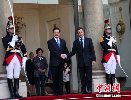 当地时间11月4日下午,正在这里进行国事访问的中国国家主席胡锦涛在巴黎的爱丽舍宫同法国总统萨科齐举行会谈。