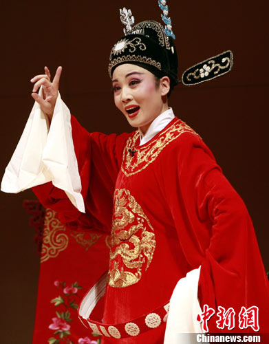 中国著名黄梅戏表演艺术家韩再芬携安庆再芬艺术剧院演员剧团11月4日晚在美国纽约哥伦比亚大学献唱。图为韩再芬正在表演黄梅戏《女驸马》的选场“状元府”。