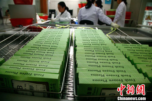 11月4日,云南昆明血液中心血库库存已经达到正常标准,各个血型相对平衡,已能满足昆明市临床用血的需要。图为检验合格的血浆。中新社记者 刘冉阳 摄
