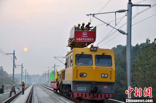 11月5日,在江苏省南京汤山镇京沪高铁南京南至镇江西区间,中铁电气化局集团一公司建设者利用接触网架线车进行接触网导线架设作业。随着京沪高铁全线铺轨施工全面展开,作为最后一项工程的电气化工程进入挂网架线关键施工阶段。中新社发 李朝臻 摄