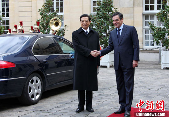 中国国家主席胡锦涛当地时间11月5日上午在巴黎会见法国总理菲永。图为菲永在总理府内铺设的红地毯上迎接刚刚下车的胡锦涛。中新社发 张朔 摄