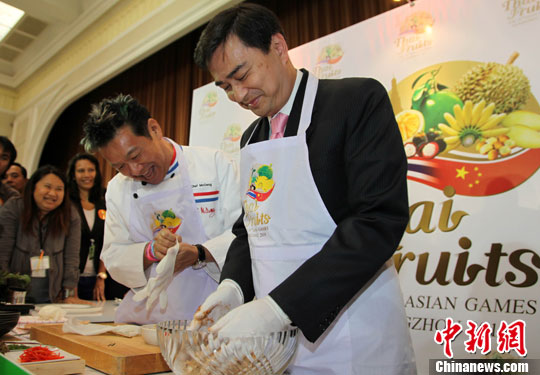 11月5日下午,“泰国水果献礼2010广州亚运会”活动在泰国总理府举行。图为泰国总理阿披实在展示现场的水果烹饪秀。中新社发 余显伦 摄