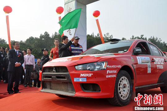11月5日,2010年亚太汽车拉力赛龙游站拉开帷幕,来自国内外的87辆赛车汇聚一堂展开较量。比赛总里程657公里,赛段约229.19公里。图为浙江省副省长王建满为比赛发车。余哲 摄