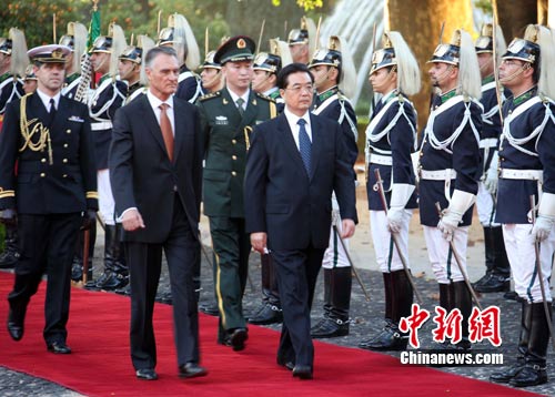 当地时间11月6日下午,中国国家主席胡锦涛来到葡萄牙总统府,同席尔瓦总统举行会谈。会谈开始前,席尔瓦总统举行欢迎仪式,欢迎胡锦涛主席首次对葡萄牙进行国事访问。作 者:张朔
