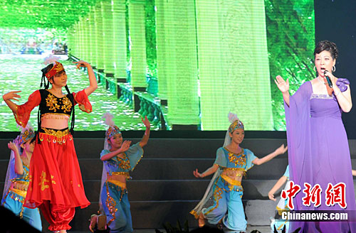 图为著名歌唱家关牧村在晚会第三篇章——《硕果满枝头》中演唱。中新社发 张勤 摄