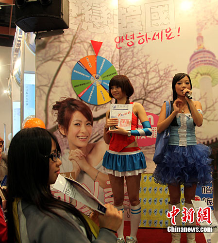 11月7日,正在台北世贸中心举行的2010台北旅展。处处可见抢夺游客生意的美女。中新社记者 陈立宇 摄