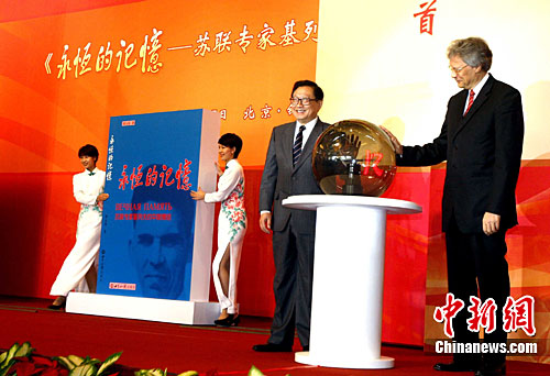 11月7日,《永恒的记忆——苏联专家基列夫的中国情绪》一书在北京钓鱼台国宾馆举行首发式,前国家主席江泽民为该书定名、题名并作序。该书讲述了20世纪50年代苏联援华专家基列夫在长春一汽近4年的工作经历,以及他为中国汽车工业发展和中苏中俄友好作出的贡献。图为首发式上全国人大常委会副委员长华建敏与俄罗斯驻华大使拉佐夫为新书剪彩。中新社记者 张宇 摄