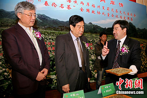 全国政协会议指定用茶“春伦”牌茉莉花茶获得十届全国政协副主席李蒙(中)和中国书协分党组书记、常务副主席赵长青(左)的高度评价。王保胜 摄