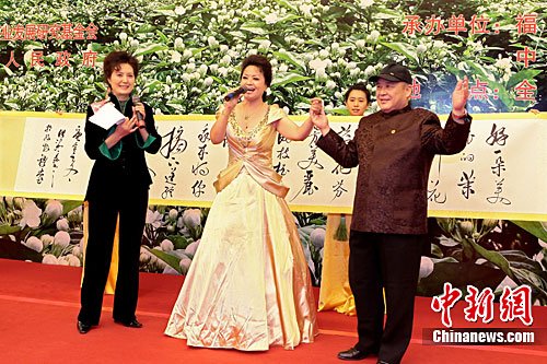 伴随着著名军旅歌唱家韩芝萍(中)现场演唱的《好一朵茉莉花》,中国人民革命军事博物馆书画研究院常务副院长、中国书法家协会理事李洪海(右)当即挥毫泼墨:“好一朵美丽的茉莉花••••••”王保胜 摄