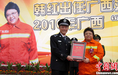 11月8日,在119消防日到来之际,空军政治部文工团副团长、著名歌手韩红应邀担任广西消防宣传大使。作为文艺界热心消防公益事业的知名人士,韩红在2008年出任中国消防形象大使,并在各地开展多项消防公益宣传活动。 中新社记者 王刚 摄