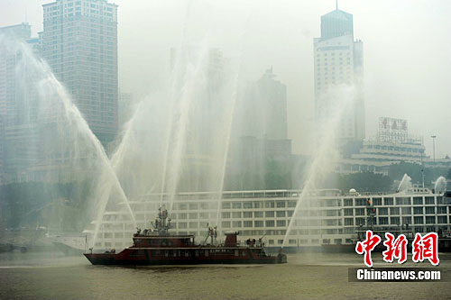 11月8日,重庆水上消防支队联合重庆新世纪游轮有限公司,在大型游轮“世纪天子”号上举行一场火灾扑救综合演习活动。据称,此次演习旨在宣传游轮存在的火灾危险性,提高游客消防安全防范意识,增强水域单位消防安全意识及自防自救能力,同时提高水上消防专业队伍对大型游轮火灾的救援能力,有效预防和遏制水域重特大火灾事故发生。图为演习现场。中新社记者 郭晋嘉 摄