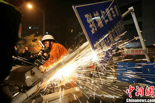 图为消防官兵正在利用切割器破拆垮塌物。中新社发 蒋旭 摄