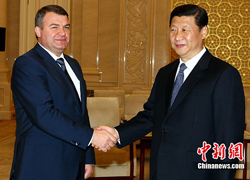 11月9日下午,中共中央政治局常委、国家副主席、中央军委副主席习近平,在北京人民大会堂会见到访的俄罗斯联邦国防部长谢尔久科夫。中新社记者 宋吉河 摄