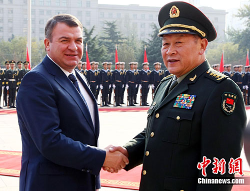 11月9日下午,中国国务委员兼国防部长梁光烈,在北京八一大楼会见到访的俄罗斯联邦国防部长谢尔久科夫。中新社记者 宋吉河 摄