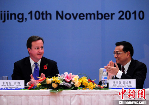 11月10日上午,主题为《携手共创经济增长》的中英工商峰会在北京举行,中共中央政治局常委、国务院副总理李克强(右)与正在中国访问的英国首相戴维·卡梅伦共同出席并分别致辞。