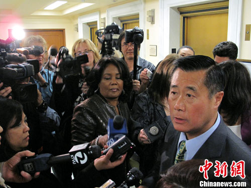 当地时间11月10日,美国加州华裔参议员余胤良向旧金山市选务局正式递交文件,申请明年11月参选旧金山市长。图为余胤良在选务局办公室前举行记者会。