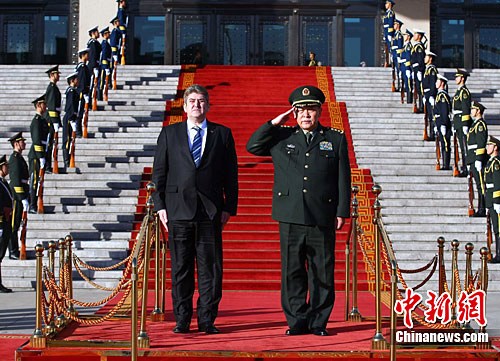 11月11日下午,国务委员兼国防部长梁光烈,在北京八一大楼为到访的罗马尼亚国防部长加布里埃·奥普雷亚举行欢迎仪式,之后双方在友好的气氛中举行了会谈。中新社记者 宋吉河 摄