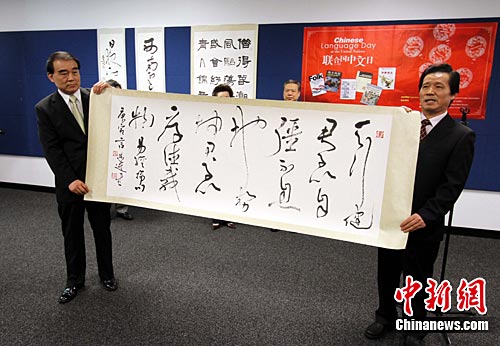 联合国首届“中文语言日”庆祝活动12日在纽约联合国总部举行。作为中文日庆祝活动的主体项目,中国当代书法家言恭达作品特展同时开幕。