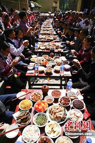 11月12日,云南元阳热情好客的哈尼族人摆起传统的长街宴,迎接来自各地的客人。长街宴是哈尼族的一种传统习俗,数百张桌子排在一起,恰似一条长龙,“长街宴”也因此而得名。