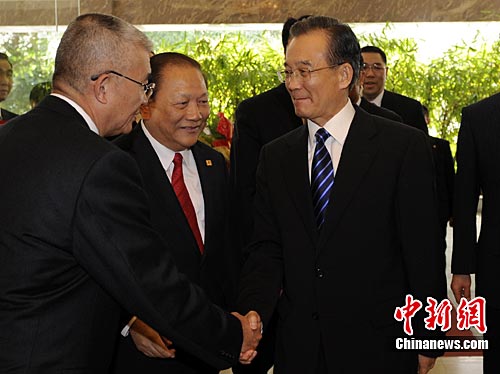 11月13日,中央驻澳联络办主任白志健(中)、副主任徐泽在澳门欢迎国务院总理温家宝。中新社记者 廖攀 摄