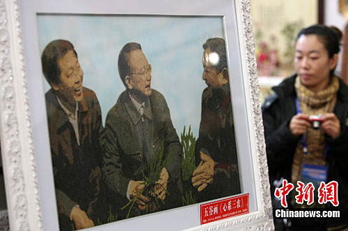 10月13日,一幅题为《心系三农》,描述温家宝总理田间调查场景的“五谷画”在北京展出,吸引了观众的注意。当日,第二届全国优质农产品展销周在北京全国农业展览馆开幕。来自全国近20个省区的优质农产品参展,其中包括一些民间特色手工艺品。五谷粮食画是以各类植物种子和五谷杂粮为本体,通过粘、贴、拼、雕等手段,利用其它附料粘贴而成的图画。粮食要经过特殊工艺处理,利于永久保存。中新社记者 苏丹 摄