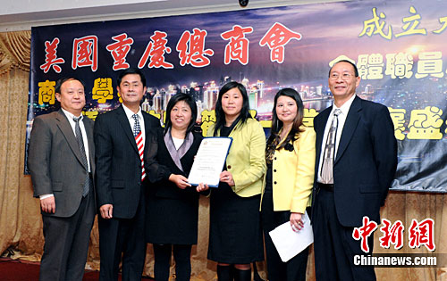 当地时间11月12日晚,美国重庆总商会在纽约宣布成立。包括中国驻纽约总领馆领事胡爱民、纽约市议员顾雅明、纽约州众议员孟昭文等200余人参加了就职典礼。张孟娜出任首届美国重庆总商会会长。中新社发 龚文谟 摄