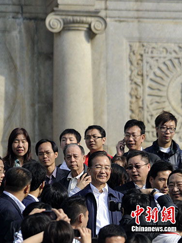 11月14日,国务院总理温家宝首次视察澳门特别行政区,在参观大三巴牌坊时回答记者提问。中新社记者 廖攀 摄