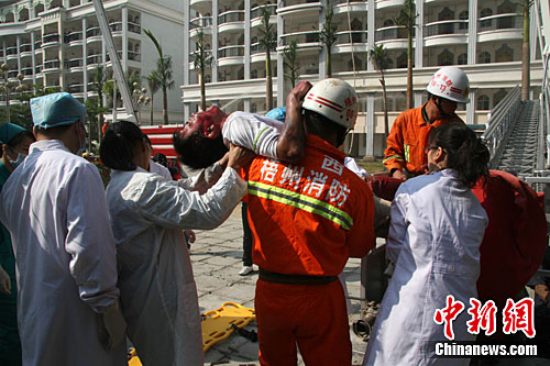 11月13日,广西梧州消防支队联合广西教育厅、梧州学院等单位开展消防实战演练活动,广西15所高校代表以及5000多名学生现场参加了疏散演练。中新社发 林康 摄