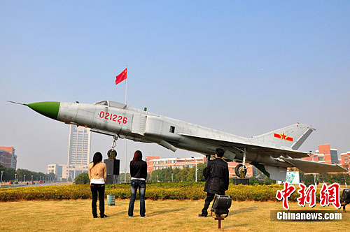 11月14日,三位大学生在校园观看中国制造的喷气式战斗机。日前,八架由中国制造的歼击机、直升机、战斗机等运抵南昌,落户南昌航空大学校园,用于航空教学,营造航空文化,激励师生“航空报国,献身国防”事业。中新社发 段长征 摄