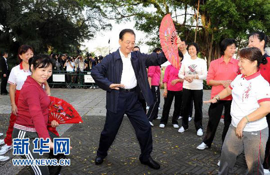 11月14日,国务院总理温家宝来到澳门大炮台花园,同在这里晨练的市民亲切交流,一起练习太极拳并学练太极扇。