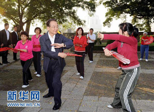 11月14日,国务院总理温家宝来到澳门大炮台花园,同在这里晨练的市民亲切交流,一起练习太极拳并学练太极扇。饶爱民 摄