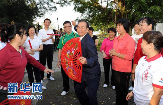 11月14日,国务院总理温家宝来到澳门大炮台花园,同在这里晨练的市民亲切交流,一起练习太极拳并学练太极扇。饶爱民 摄
