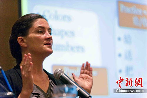 图为旧金山ABC语言学校创办人梅尔在论坛上讲述如何使用趣味教学法学中文。中新社发 陈钢 摄