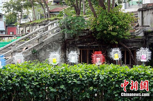 为呼应台北花博,台北市政府方面近日借助老城区万华区406广场一带的老建筑遗迹,推出一项“公共艺术运补”计划,通过各种形式的装点布置,形成一组组具有视觉装置艺术效果的景观。中新社记者 王健 摄