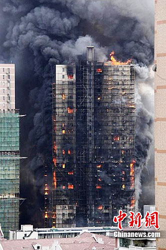 11月15日14时,上海余姚路胶州路一栋正在进行外立面墙壁施工的高层住宅脚手架忽然起火,火势较大,并开始向楼里蔓延。据悉,消防人员已经赶赴现场。图片来源:CNSPHOTO 徐安安 摄