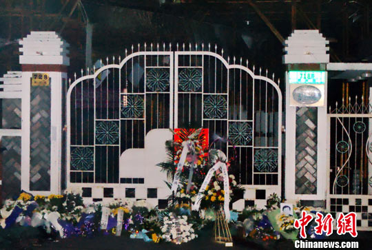 2010年11月16日,上海静安区,发生火灾的大楼入口处摆放着市民敬献的鲜花。中新社发 井韦 摄 图片来源:CNSPHOTO