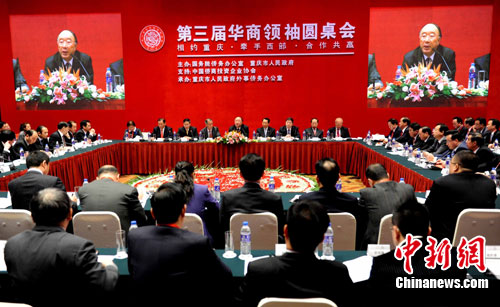 11月18日,“第三届华商领袖圆桌会”在重庆开幕。来自中国、美国、俄罗斯、加拿大、英国、法国、德国、西班牙、泰国、印尼、马来西亚、菲律宾、新加坡、澳大利亚、日本、巴西、南非及香港、澳门等30个国家和地区近130位知名华商领袖、华商组织负责人出席会议。图为重庆市委副书记、重庆市政府市长黄奇帆演讲。