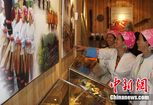 11月18日,几位壮族大嫂广西龙胜参观壮族生态博物馆。日前龙脊壮族生态博物馆正式对中外游人开放。龙脊壮族生态博物馆位于广西桂林市龙胜各族自治县和平乡东北部龙脊村平寨,是龙胜各族自治县首个壮族历史资料和展品最全面的博物馆。聚居在龙脊地区的壮族保存着以梯田景观为代表的山地农业稻作文化、以“白衣”为代表的服饰文化,以干栏民居为代表的箭镞文化、以碑刻和石板路为代表的石文化、以铜鼓舞和弯歌为代表的歌舞文化,以寨老制度为代表的民族自治制度文化和以“龙脊四宝”为代表的饮食文化,是广西北部壮族的典型代表。中新社发 周恩平 摄