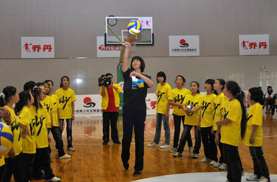 图:郎平亚运期间亲授贫困儿童传递体育快乐
