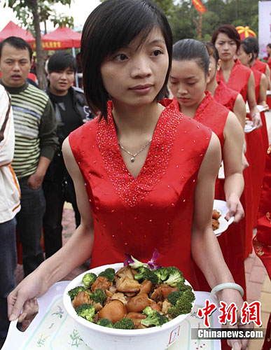 福建泉州涂岭猪脚美食节11月18日在侨乡泉州泉港区涂岭镇举行,吸引当地23位厨师参加猪脚美食烹饪比赛和众多食客前来大饱口福。 图为美味猪脚正由礼仪小姐端送呈专家品评。 红烧猪脚是福建省泉州市泉港区涂岭镇地道的传统美食,成为当地民众宴请亲朋好友、款待过往宾客的“招牌菜”。中新社发 泉港 摄
