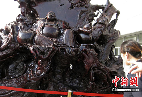 11月19日,中国—东盟博览会木材与木制品展在广西南宁开幕,越南商家展出的一尊7吨重的木质“红星弥勒大佛”吸人眼球。据称,该大佛由一棵巨大的天然红星木经资深工匠历经16个月手工精雕细琢而成,巨木生长于东南亚的老挝、柬埔寨、越南3国接壤处,形成至今已近千年。中新社记者 王刚 摄