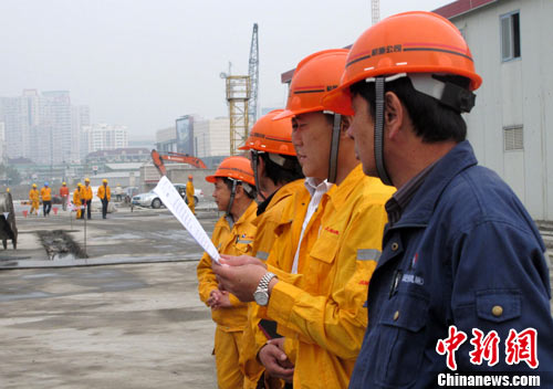 11·15火灾过去了四天,上海市各工地11月19日停工两小时进行自查。各个工地已经对特殊材料实行了分类的堆放,并且有专人看守,各个工地也组织了职工进行消防安全的学习。中新社发 陈婷婷 摄