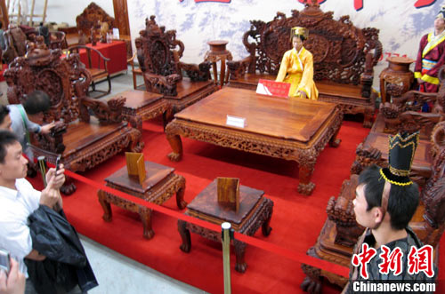 11月20日,广西南宁会展中心内,一套标价1.28亿元人民币的“天下第一座”,携君臣及侍卫闪亮登场,吸引众人眼球。当日,中国—东盟博览会木材与木制品展在南宁举行。