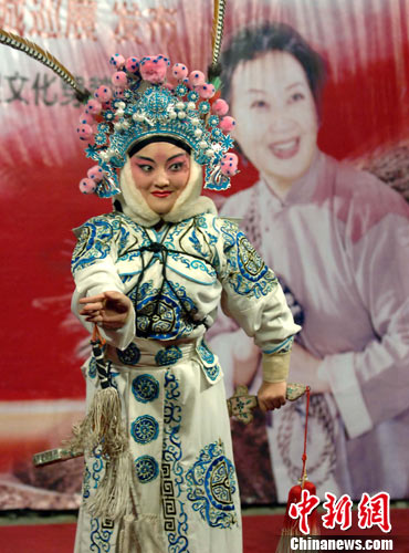 11月20日,由中国戏曲现代戏研究会主办的《山村母亲》晋京汇演暨运城地理农产巡展新闻发布会在北京新晋商会馆举行。11月23日至26日,大型蒲剧现代戏、国家舞台艺术精品剧目《山村母亲》将在首都长安大戏院、北京大学隆重上演,一位来自贫困山村的母亲将以无私而崇高的大爱向观众讲述“做母亲难,做农村大学生的母亲更难!”的感人故事。出演母亲演员为运城蒲剧青年实验团一级演员,中国戏剧“梅花奖”、“文华奖”获得者,运城市文化艺术学校副校长兼市蒲剧青年实验团团长景雪变。图为文化艺术学校学生兼运城市蒲剧青年实验团演员,十七岁小梅花贾锐在发布会上献艺表演剧目《挡马》。