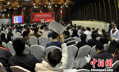 11月20日,竞买人在嘉德2010年秋季拍卖会上举牌竞拍。当日,中国嘉德2010秋季拍卖个门类专场拍卖陆续揭幕,包括中国书画、瓷器工艺品、古籍善本、中国油画及雕塑、珠宝翡翠以及首次推出的腕表等门类的3000余件拍品将悉数亮相。此次嘉德秋拍可谓群星云集、巨制迭出。有业内人士表示,众多重要拍品领衔的嘉德秋拍,料将破多项中国拍卖行业纪录。