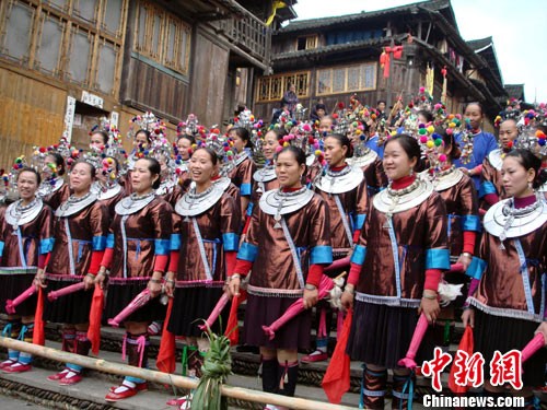 11月20日,广西柳州三江侗族自治县林溪乡冠洞村冠小屯侗族民众“拦路迎宾”。当地侗族姑娘身着民族服饰站成数排,唱着拦路歌,用米酒迎客。