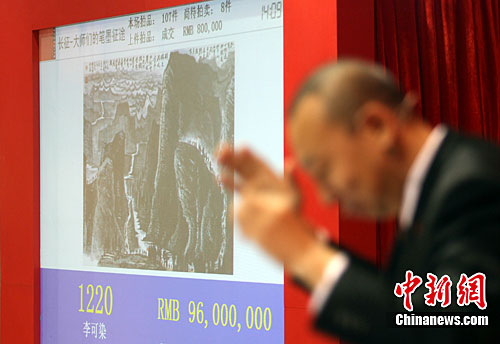 11月22日,中国嘉德2010秋季拍卖会《长征——大师们的笔墨征途》专场中,李可染画作《长征》拍出人民币1.075亿元,打破早先由中国嘉德今年春拍时由张大千画作《爱痕湖》1.008亿创造的中国近现代书画纪录。(注:李可染(1907-1989)《长征》1959年作 钤印:李、可染、毛主席诗意 题识:红军不怕远征难,万水千山只等闲。五岭逶迤腾细浪,乌蒙磅礴走泥丸。金沙水拍云崖暖,大渡桥横铁索寒。更喜岷山千里雪,三军过后尽开颜。毛主席长征诗意。一九五九年春,可染试画初稿。)