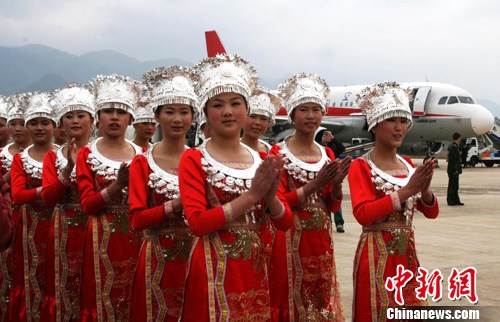 11月22日11时10分,随着载有132名旅客的3U8641次航班降落在重庆市黔江舟白机场,重庆首个市内航班——重庆至黔江航线正式开通,航班飞行时间为40分钟。图为重庆市黔江区舟白机场内,不少当地少数民族少女身着盛装庆祝航线开通。