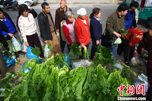 11月23日,云南昆明街头的蔬菜直销点吸引大批市民排队购买。昆明市年内将在市民住宅区附近设置不少于300个蔬菜直销点。直销点蔬菜价格按保本微利的原则确定,为市民提供平价的新鲜蔬菜。中新社发 任东 摄