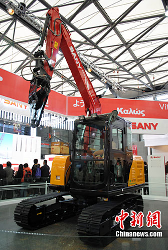 11月23日,上海宝马展上一台随着音乐翩翩“起舞”的纯电动小型液压挖掘机成为观展者追捧的“明星”。由中国工程机械企业三一重工独立研发的该挖掘机采用全电力驱动,拥有低噪音、零排放等环保、低碳特点,特别适合对于环保要求颇高的城市建设、水利改造工程。该机器的研制成功标志着中国纯电动液压挖掘机研发能力又提升了一个台阶。通过遥控操作该机可实现无线数据监控、音乐控制、语音控制等。现场工作人员随机输入音乐执行动作,挖掘机便随着音乐振幅的变化而改变动作的快慢、执行抖动等,随音乐“起舞”。中新社记者 肖前辉 摄